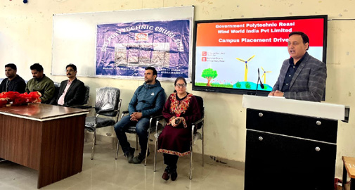 Er. Arun Bangotra, Principal of the Institute thanked Wind World (India) for providing the job opportunity to the Polytechnic students. He also impressed upon the students to participate in the placement drive with full enthusiasm and make full use of their professional and technical skill for employability to various organizations. He motivated them to enhance their technical skills, discipline, and professionalism to meet industry standards. He emphasized the importance of such industry–institution interactions in shaping students' careers. Mr. Vishwas Mahajan Dy. General Manager-HR from Wind World (India) delivered a pre-placement talk to the students, following which written tests and personal interviews were conducted. He delivered an informative session about the company profile, work culture, and the placement process. Mr. Nitin Jain (TSM), and Mr. Siyaram Verma (Technical Trainer) from Wind World (India) encouraged students to prepare themselves for industry challenges and assured them of guidance and support from the organization. The arrangements for the placement drive were done by the Training and placement cell of college Mr. Himanshu Bakshi, Mr. Ajay Dogra, Mr. Sunil Kumar, Mr. Parshotam lal, Ms. Vandana and Ms. Ayushi. Other present were faculty members Ms. Esha, Ms. Meenakshi, Ms. Veena, Mr. Parshotam and Mr. Anil. The students thanked the college administration for organizing first campus placement drive, which proved to be highly informative and motivating for the students and marked another successful step towards strengthening industry–academia collaboration at Government Polytechnic College, Reasi.